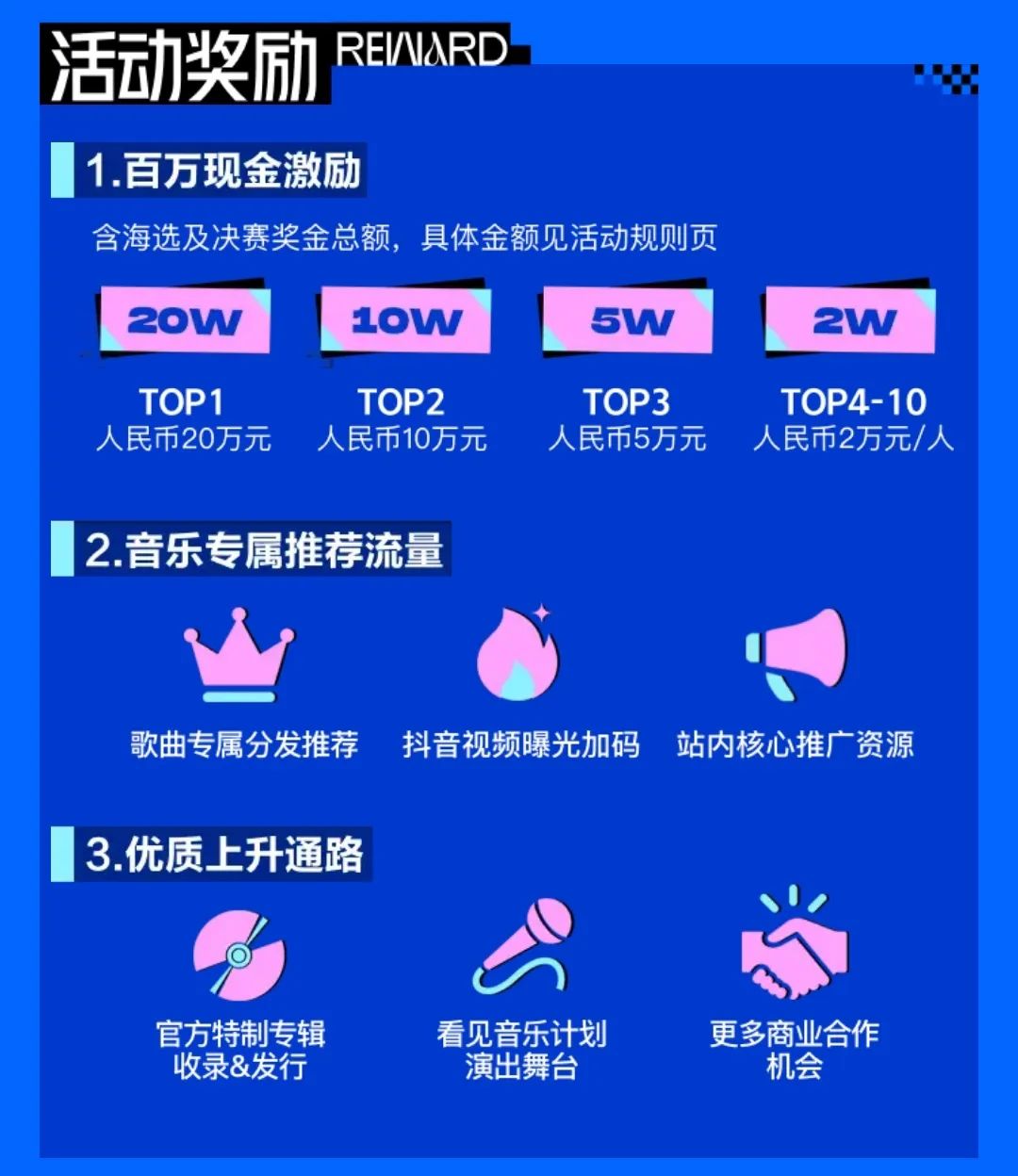 在现金奖励方面,在决赛阶段,总榜歌曲Top10将有机会收获抖音站内专属推广和丰厚现金奖励,前三名人气音乐人将会坐拥更多。