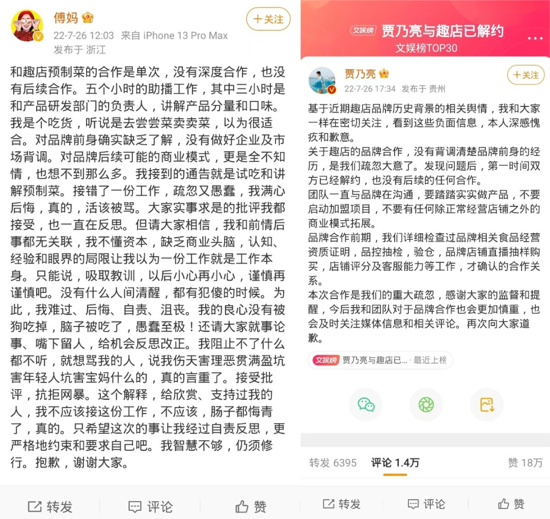 就在傅首尔发布道歉声明后,罗敏已经第一时间删掉了曾经的直播预告,唯一留下的一条微博,是关于7月18日趣店预制菜品牌战略发布会的,但评论已经关闭。高举高打的新气象似乎转瞬即逝,只剩下忙着道歉的贾乃亮和傅首尔,与沉默的罗敏。