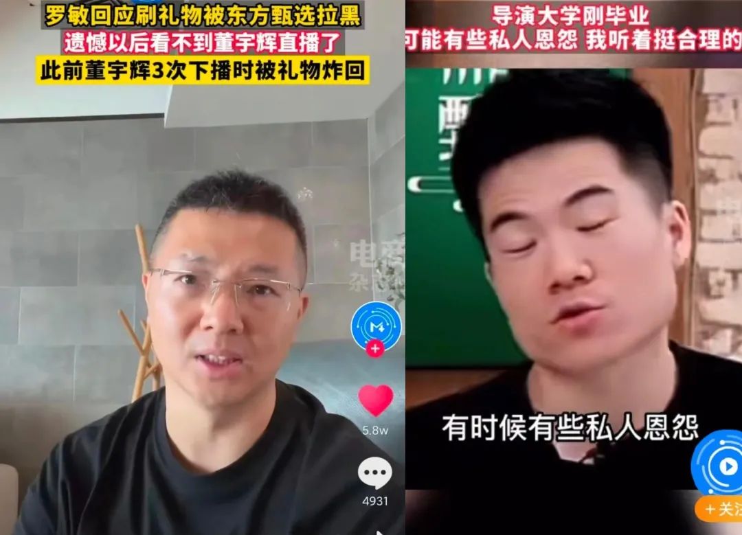 原本只是榜一大哥刷礼物被拒的剧情,却被罗敏事后「张扬」出去,他录制了一个短视频,说刷礼物是因为喜欢董宇辉,还说董老师直播很辛苦,想鼓励一下。可惜现在被拉黑了,以后看不到董老师直播了。
