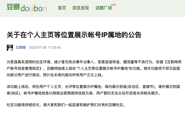 7月26日,豆瓣官方发布公告,将陆续上线在“个人主页等位置展示帐号IP属地”的功能。相关功能将于即日起面向部分用户进行测试,预计在本周内面向所有用户正式上线。该功能上线后,将在用户个人主页、长评等位置展示IP属地,境内展示到省(自治区、直辖市),境外展示到国家(地区),帐号IP属地信息以网络运营商提供信息为准,用户暂时无法主动开启或关闭相关展示。