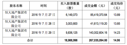 另外,于廊坊发展停牌前举牌的恒大地产集团在7月27日至7月29日通过上交所集中竞价交易系统增持公司无限售条件流通股1898.90万股,占公司总股本4.995%。此次权益变动后,恒大地产集团持有公司3801.70万股,占公司总股本10.000%。