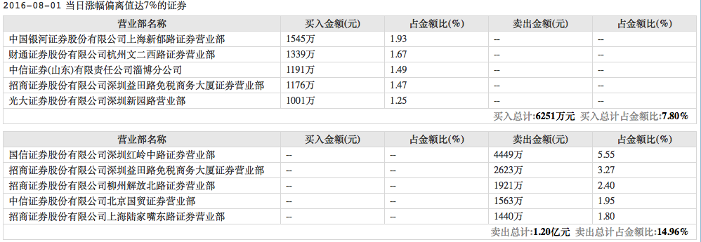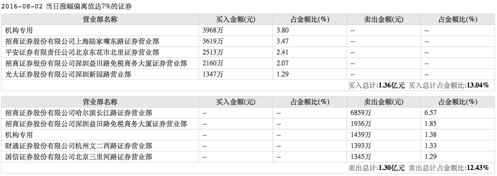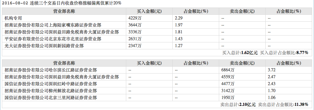 8月1日和2日,廊坊发展因当日涨幅偏离值达7%登上龙虎榜。8月2日,廊坊发展的买一和卖三席位被机构占据,招商证券深圳益田路免税商务大厦营业部则同时出现在了买四和卖二席位,买入金额2160万元,卖出1936万元。8月1日,这家营业部也在买入1176万元的同时卖出2623万元。两日共计净卖出约1223万元。
