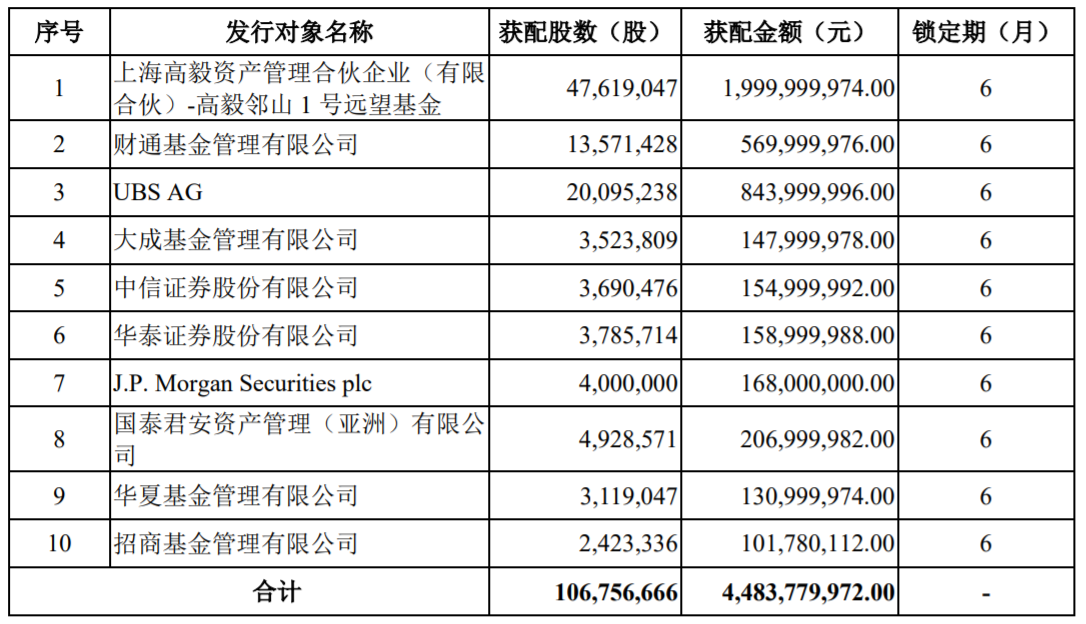 7月26日晚,复星医药披露定增情况。从发行对象名单来看,获配数量前三分别为:上海高毅资产管理合伙企业-高毅邻山1号远望基金(下称高毅邻山基金),获配金额为20.00亿元;UBS AG获配8.44亿元;财通基金管理有限公司获配5.70亿元。