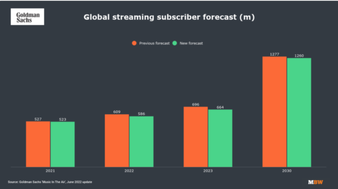 高盛此前认为,2030年,全球年度音乐用户 ARPU 将达到每年42.8美元,它现在已将这个数字提高到45.8 美元。每年 3 美元的增长听起来可能不算多,但别忘了,这个预测的基数是全球预计12.6 亿付费音乐用户。