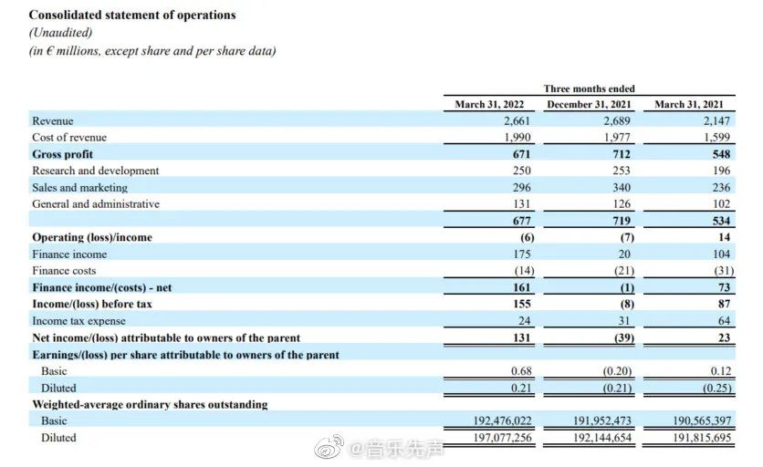 但运营情况仍不如人意,Spotify今年一季度的运营亏损 600 万欧元,而上一季度的运营亏损为700万欧元。重要原因,就在于内容成本高企,比如Spotify的内容成本高达19.90亿欧元,在总营收的占比超过74.78%,这也让Spotify在十余年的绝大多数时间都是亏损状态。