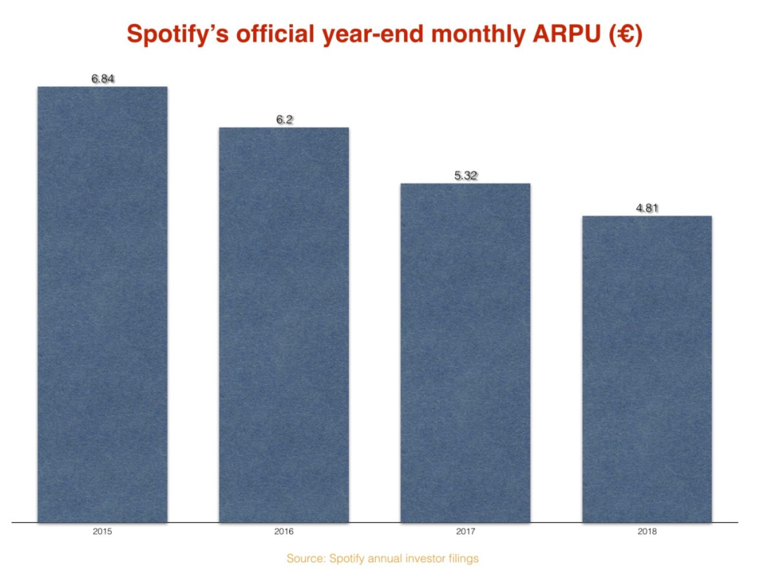 综合影响下,这也导致音乐平台的ARPU(每位用户平均收入)持续下降。数据显示,过去几年,Spotify 的ARPU持续下降,从2015年的 6.84欧元降至 2021 年的 4.29 欧元,跌了37.28%。