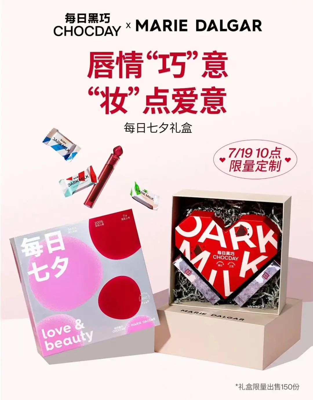 首先,从七夕必备元素之一“巧克力”来看,在2022年的七夕节,玛丽黛佳X每日黑巧打造了每日七夕礼盒,欲用甜力全开的牛奶黑巧和纯欲浪漫的石头唇釉,在这个节日收获消费者的pick。