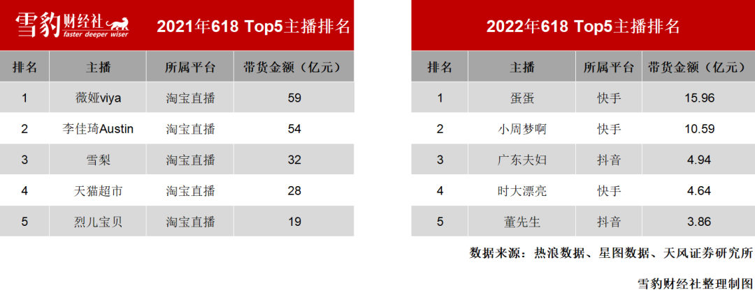 天风证券研报显示,今年618,Top 5主播带货销售额的占比,从去年的30%下降到3%。对比两次618的带货数据,去年同等名次主播的销售额是今年的3~7倍。