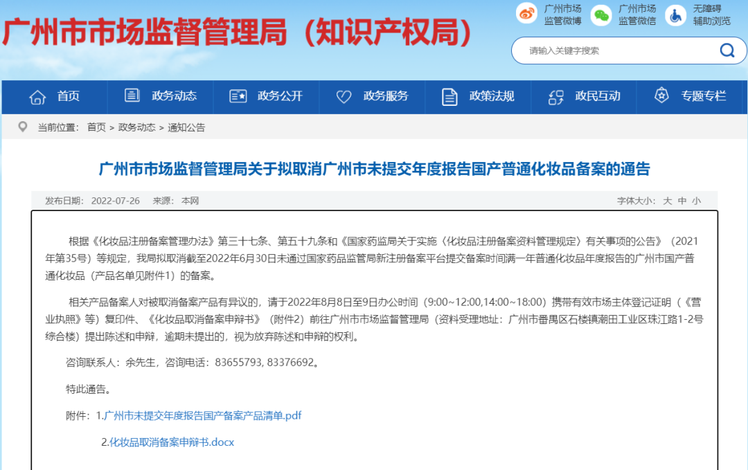 7月26日,广州市监局发布了《广州市市场监督管理局关于拟取消广州市未提交年度报告国产普通化妆品备案的通告》(下称《通告》)。