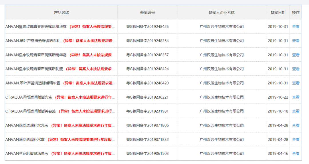 今日广州发布的《通告》中,同时以附件的形式公布了《广州市未提交年度报告国产备案产品清单》,该清单共计4639页,列有近20万个产品,包括广州市婵姿化妆品有限公司、广州汉芳生物技术有限公司、广州市艾雪化妆品厂有限公司等旗下产品。化妆品观察在国产普通化妆品备案信息平台查询广州汉芳生物技术有限公司发现,产品大多显示“异常!备案人未按法规要求进行年度报告”。
