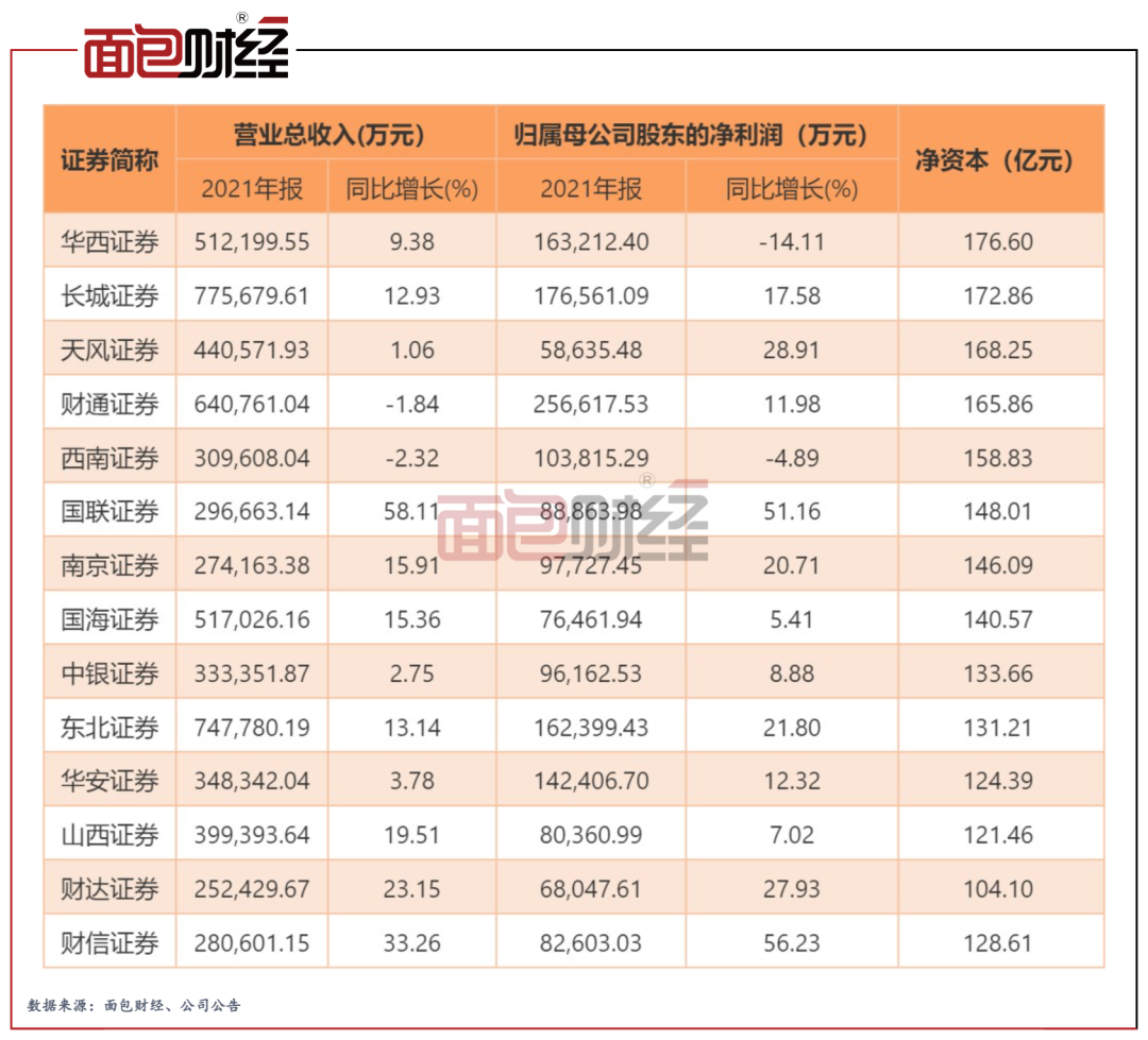 从业绩规模上看,在净资本规模介于100亿元至200亿元的13家上市券商中,财信证券的营收仅高于南京和财达证券,归母净利润仅高于财达、山西、国海和天风证券,总体规模较小。