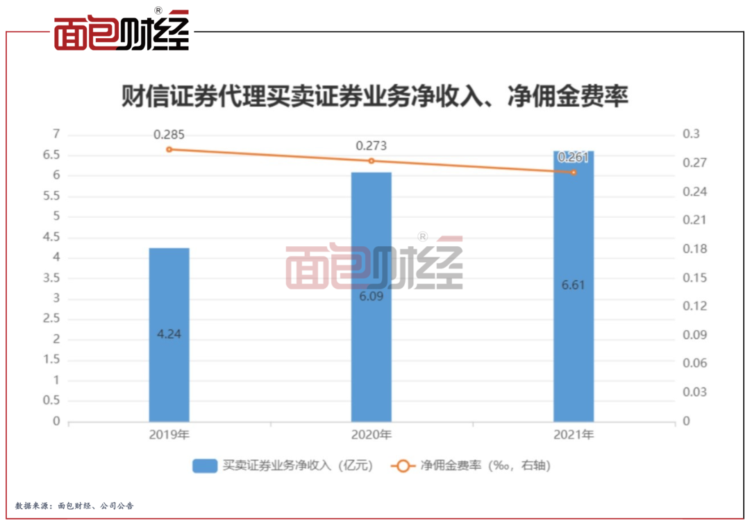 2019年至2021年,财信证券的证券经纪业务收入占比持续超过三成。其中,2021年,公司代理买卖证券业务产生净收入6.61亿元,占当期营收超二成。但考虑到公司营业部数量并不具优势,且净佣金费率随着行业趋势不断下滑,该业务的成长性或较弱。