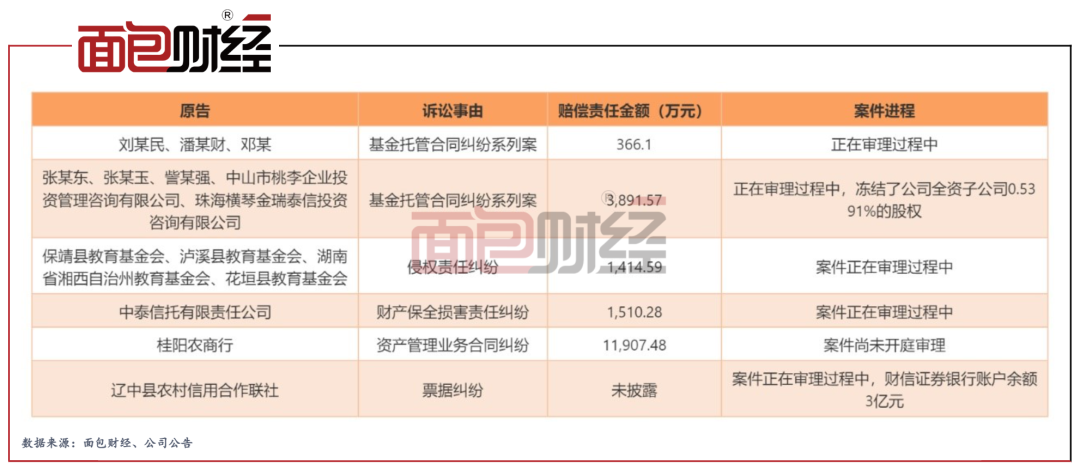 除业绩表现外,财信证券或还需关注其内控管理。截至最新,公司作为被告,合计涉及6起1000万元以上的重大未决诉讼。