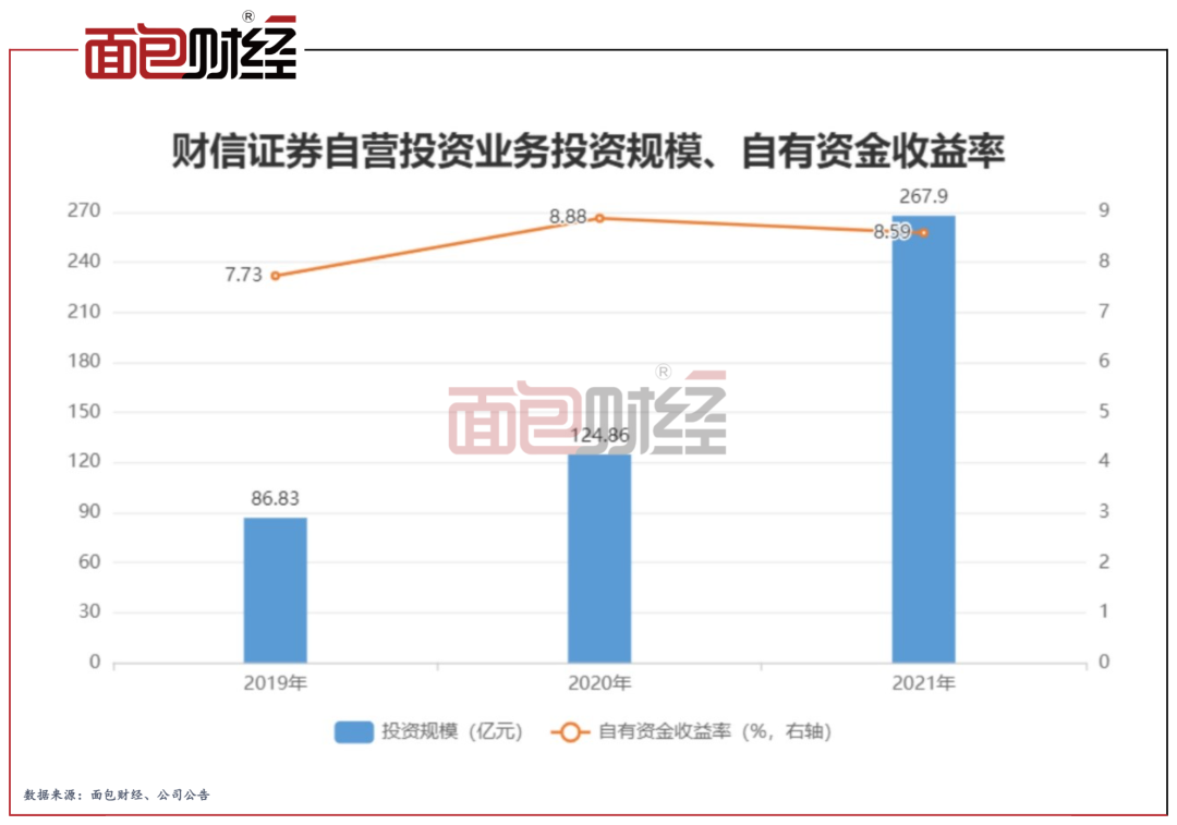 2021年,财信证券自营投资业务产生收入的占比超过三成,此前两年,该业务的收入占比也超过两成。2021年,该业务下的投资规模和投资收益分别为267.9亿元和9.48亿元,分别同比增加1.15倍和1.25倍,当年公司自营投资业务收益增长主要系投资规模增长,而收益率出现轻微下跌。