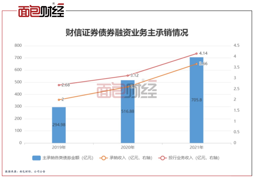 一定程度上,财信证券的债权融资业务较为依赖湖南省当地经济。例如,2021年,公司参团分销地方政府债106.39亿元,占当期公司参与的分销债券总规模超九成。