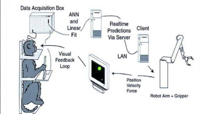 1969年,科学家埃伯哈德·费兹(Eberhard Fetz)把一只猴子固定在实验椅上,然后在实验猴的脑部插入一个电极用来采集猴脑中相应神经元发出的电信号,而电极的另一端连接着一个仪表盘。当猴子神经元的放电率超过事先设定的阈值后,猴子眼前的仪表盘指针出现移动,同时猴子会获得食物奖励。