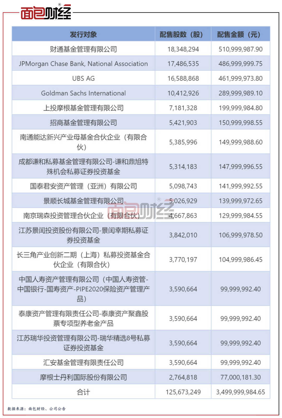 星源材质近日完成定增,摩根大通、财通基金等18位机构投资者最终获配,募集资金总额35亿元。