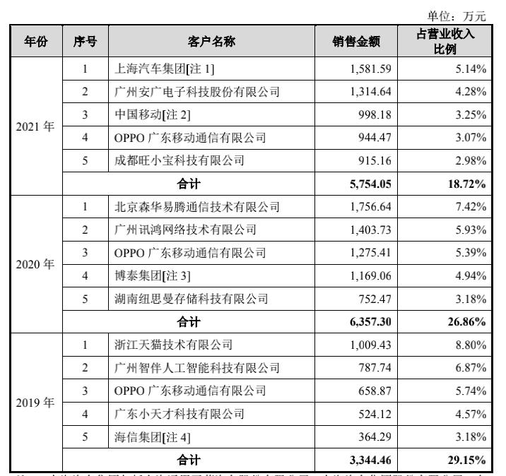此外,近3年,思必驰前5大客户变动频繁,仅OPPO广东移动通信有限公司一家连续出现在前5大客户中,但2021年,思必驰对它的销售额是在下滑的。