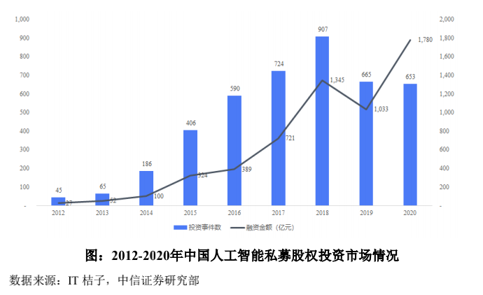 不过,2019年以来,一级市场中AI相关的投资有所减弱。2018年到2020年,人工智能投资次数分别为907件、665件、653件,融资额分别为1345亿、1033亿、1780亿,投资流向头部企业。