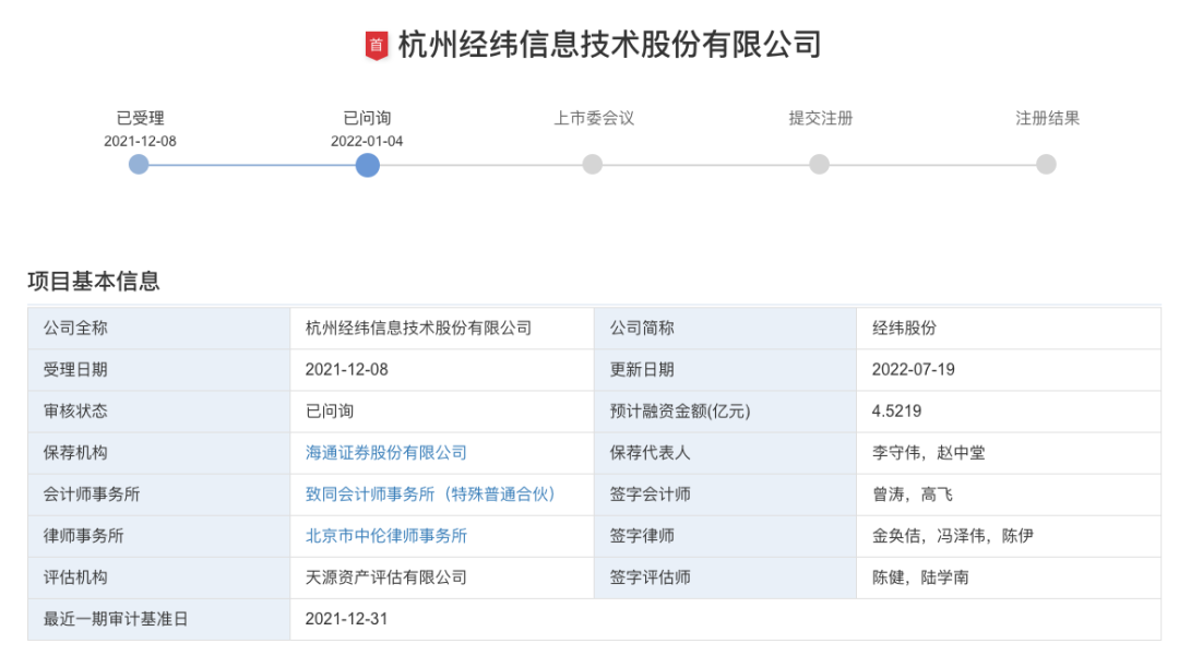 2021年12月8日,杭州经纬信息技术股份有限公司(简称为“经纬股份”)正式向深交所提交了招股说明书,拟在创业板上市。