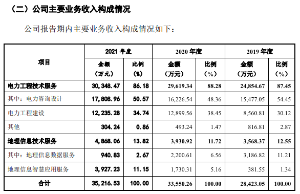 “招股书”显示,过去三年,经纬股份电力工程技术服务业务的营收占比均在80%以上,是公司重要的营收支柱。在这之中,电力咨询设计业务也同样表现得过于亮眼,2019年-2021年,此业务占营收的比重分别为54.45%、48.36%和50.57%。