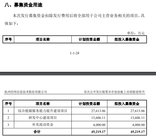 “招股书”显示,经纬股份拟募资4.52亿元,其中2.76 亿元用于综合能源服务能力提升建设项目,1.36亿元用于建设研发中心,4000万用于补充流动资金。单从名字来看,经纬股份确实是希望提升能源服务的核心竞争力。