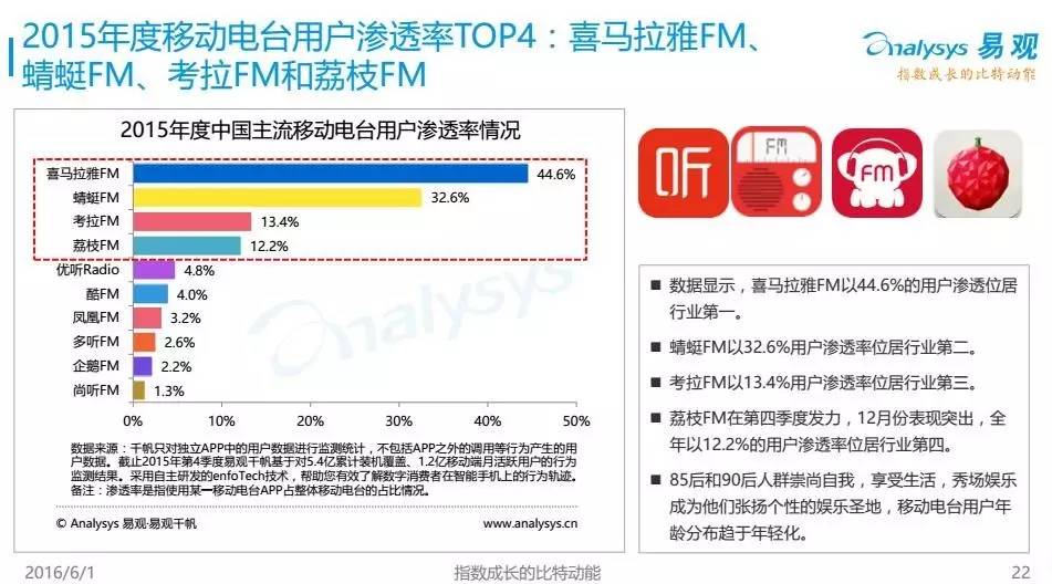 根据易观报告,2015年度喜马拉雅、蜻蜓、考拉和荔枝这四家平台占据了整个音频行业80%以上的份额。在今年3月份的用户日活渗透率调查中,喜马拉雅以74.3%的渗透率高居第一,蜻蜓则以33.5%的渗透率位居次席。
