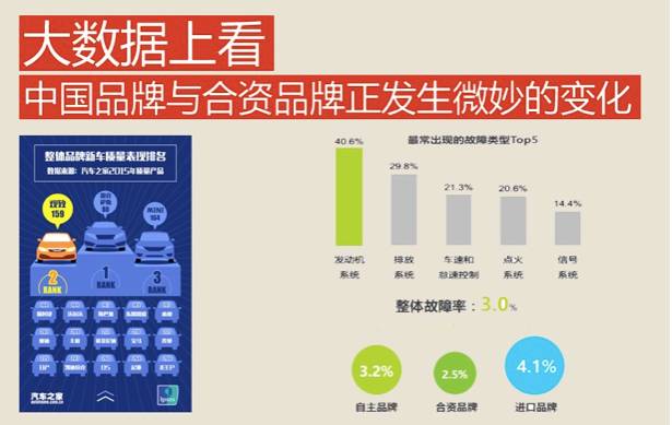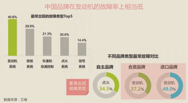 中国品牌的质量提升不仅表现在整车质量、服务方面,还体现在核心零部件上。从艾瑞汽车质量监测报告中显示,在最常见的五种车辆故障类型中(发动机系统、排放系统、车速和怠速控制、点火系统、信号系统),发生最多故障的是发动机系统。37.2%的合资品牌和49%的进口品牌都在此系统上出故障,而中国品牌则不在此列。
