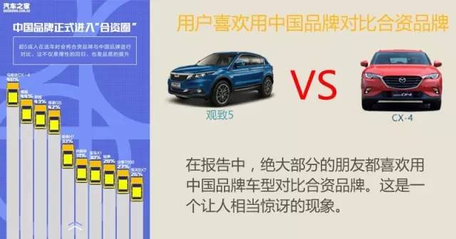 从购车者选车环节可以看到,超过50%的人在选车时,会把中国品牌车型与合资车型进行详细的对比。例如,在此次白皮书中显示,关注观致5 SUV的用户,还会拿一汽马自达CX-4、吉利博越等来进行对比。