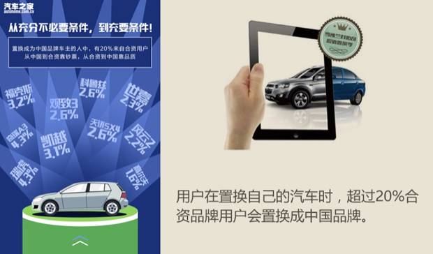另外,有一组数据令我们感到有些惊讶,置换成中国品牌的用户中,有20%是来自合资品牌用户。一般情况下,由合资车置换成中国品牌车型的,大多数为中国品牌的中高档车型,例如吉利博瑞、博越、观致5 SUV等。从这组数据也能够看得出,中国品牌中高档车型的产品品质有了较大的提升,与合资品牌对应车型之间的差距正在逐渐缩小。同时,对于整个中国品牌的都有着积极的影响。