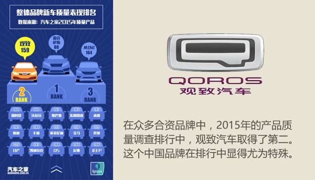 中国品牌的品质提升,并非空口无凭,而是有一定的调查数据支撑的。根据汽车之家之前做过的新车质量调查,在2015年的产品质量报告中,冠军依旧为雷克萨斯,而排在第二位的居然是中国品牌观致,第三名则为MINI。中国品牌汽车在质量上竟然比合资品牌还要好?或许很多人都不敢相信,但这对于整个中国品牌而言都是莫大的鼓舞。