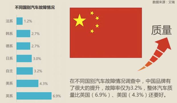 除了汽车之家的新车质量报告,另一家第三方检测机构艾瑞汽车的质量监测报告中也显示,在不同国别汽车故障情况调查中,中国品牌有了很大的提升,故障率仅为3.2%,整体汽车质量比英国(6.9%)、美国(4.3%)还要好。