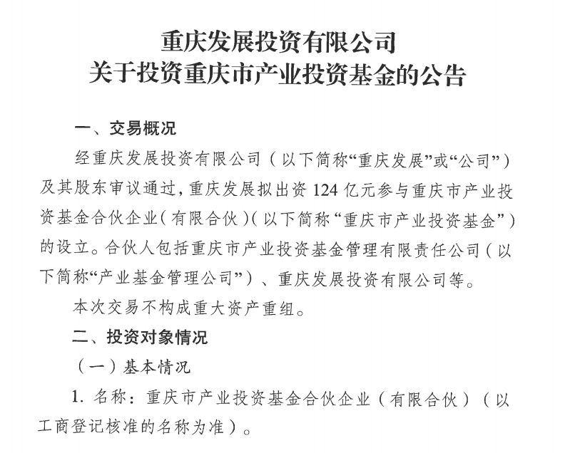 投资界-解码LP从重庆方面获悉,重庆发展投资有限公司(简称:重庆发展或公司)发布关于投资重庆市产业投资基金的公告:经重庆发展及其股东审议通过,重庆发展拟出资124亿元参与重庆市产业投资基金合伙企业(有限合伙)(简称:重庆市产业投资基金)的设立。
