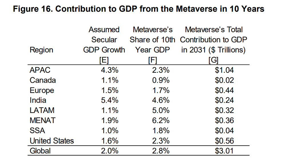 该报告称,如果元宇宙技术从2022年开始被采用,到2031年,元宇宙技术将为全球GDP贡献3.01万亿美元,其中三分之(1.04万亿美元)来自亚太地区。