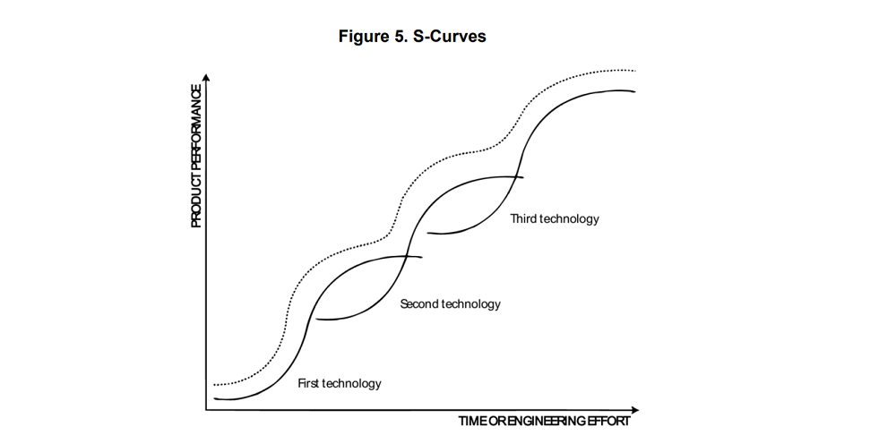 每项新技术的发展趋势都遵循S形曲线,第一阶段是发展缓慢的初创期,第二阶段是快速发展的成长期,第三阶段是成熟完善的平稳期。而随着时间的推移,不同技术的S形曲线会相互叠加,不断提高产品的性能。