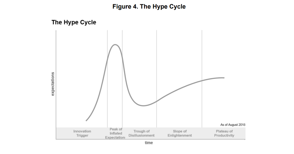 炒作周期(Hype Cycle)曲线是咨询公司Gartner于1995年首次采用的一种分析方法,Gartner公司根据其专业分析预测,推断各种新科技的成熟演变速度及要达到成熟所需的时间。炒作周期曲线主要分为五个阶段:科技诞生的促动期、过高期望的峰值期、泡沫化的底谷期、稳步爬升的光明期、稳定生产的高峰期。