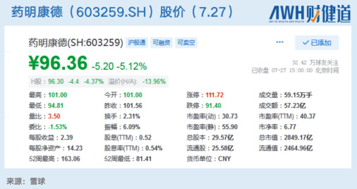 半年报业绩公布后,药明康德7月27日盘中股价一度跌超6%,当日收盘价为96.36元/股,跌幅为5.12%。