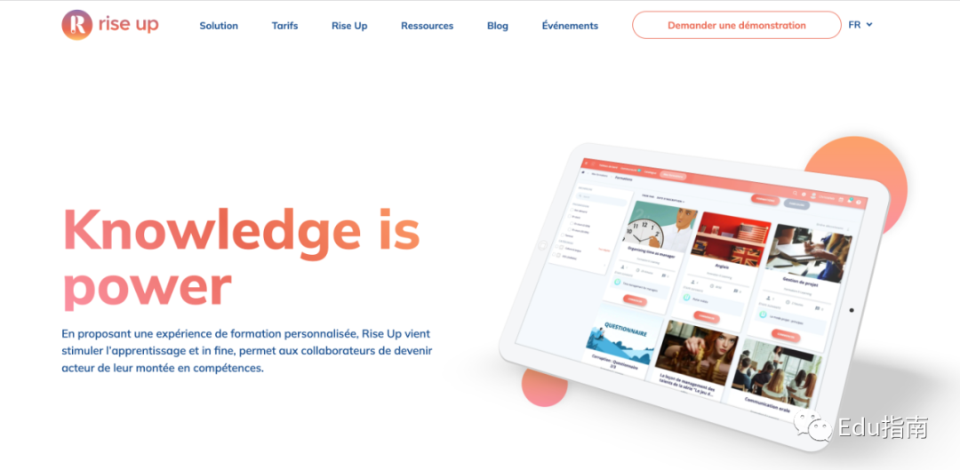 Rise Up 软件平台当前提供一站式学习解决方案,结合了 LMS(学习管理系统)、LXP(学习体验平台)、LRS(学习记录存储)、LCMS(学习内容管理系统)、移动和多模式服务。此外其解决方案,包括培训周期内所有关键阶段的单独协助、培训指导等。