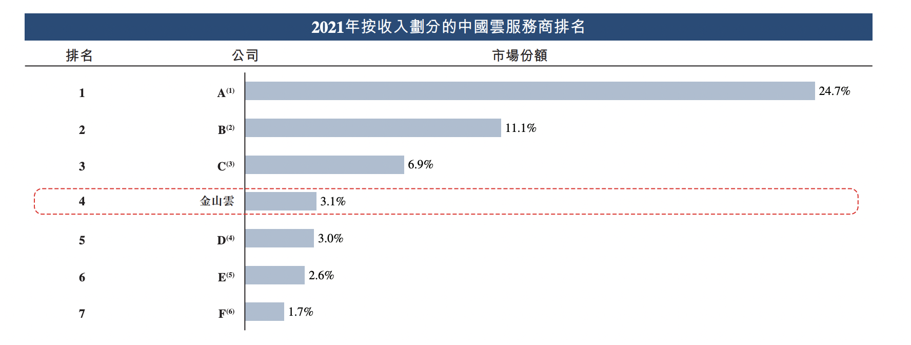 根据弗若斯特沙利文的资料,金山云是中国最大独立云服务商及中国第四大云服务商,占有3.1%的市场份额。若按云服务收入划分,2021年,中国云服务市场前七大公司的市场份额合计为53.0%。2021年,金山云位居第五大公有云服务商。