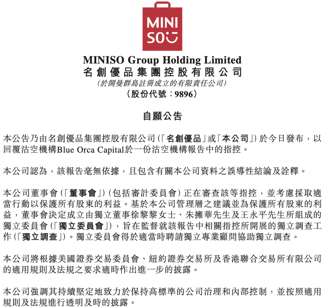 名创优品则称,董事会正在审查该指控,并考虑采取适当行动以保护所有股东的利益。基于公司管理层之建议并为保护所有股东的利益,董事会决定成立由独立董事徐黎黎、朱拥华及王永平所组成的独立委员会,旨在监督就该报告中相关指控所开展的独立调查工作,适当时将聘请独立专业顾问协助独立调查。