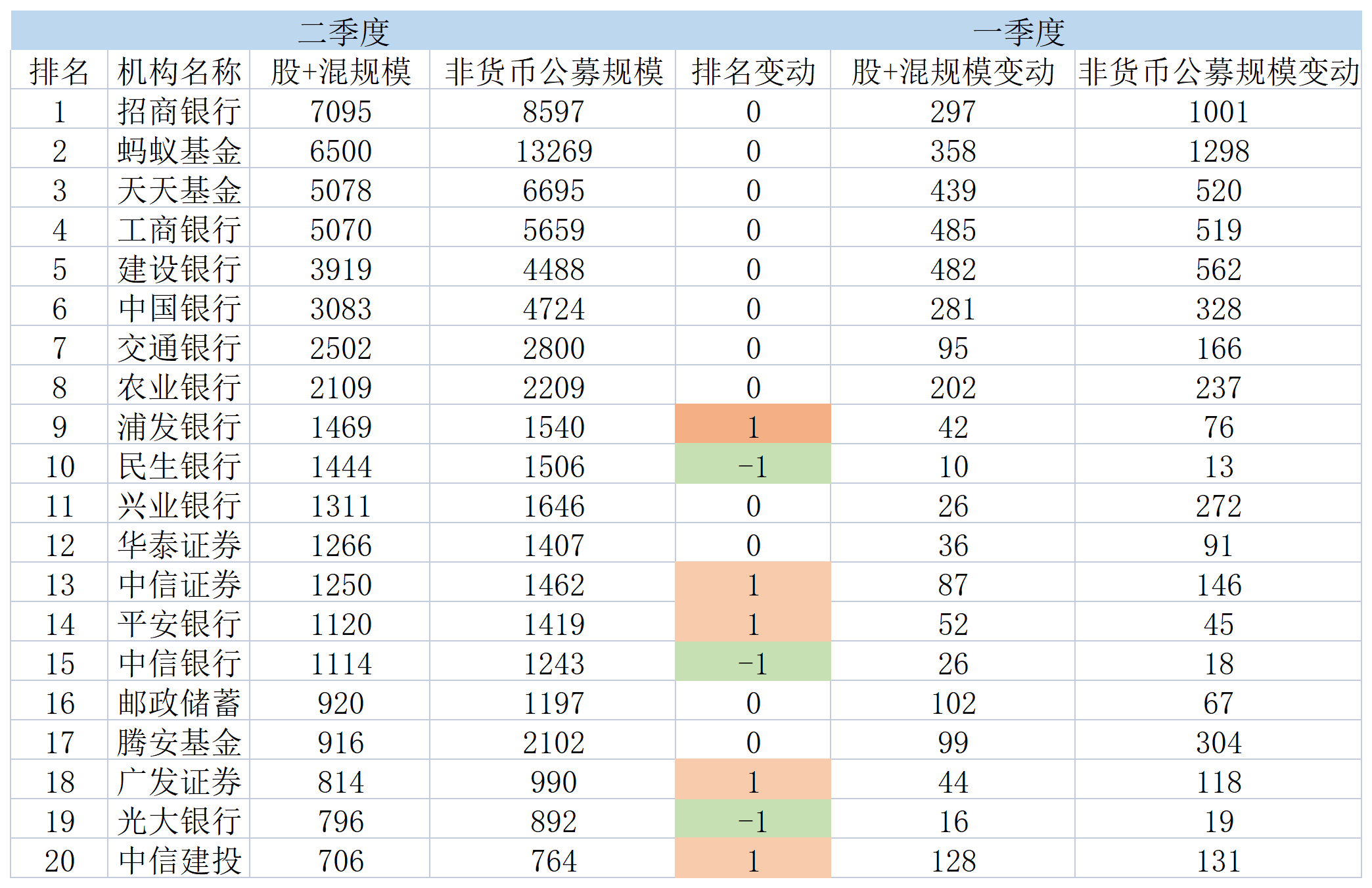 另外,天天基金、工商银行、建设银行等三家巨头,二季度非货基规模新增也都超过了500亿元,规模增幅都在10%附近。