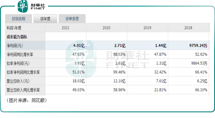 从近些年的业绩来看,该公司2021年实现营收18.03亿元,同比增长49%,其中2017-2021年的年均复合增长率为48%;2021年实现归母净利润4.01亿元,同比增长47.7%,其中2017-2021年的年均复合增长率达到了58.2%。