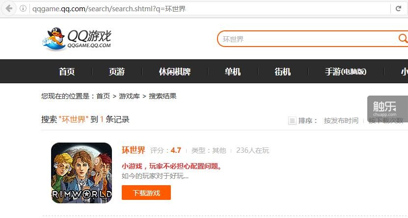 比如说,你在QQ游戏中搜索“环世界”,这是一款在Steam平台上热卖的新游戏,它竟然也能在QQ游戏中搜索得到。搜索所得的链接会跳转到“3366”这个网站上去。
