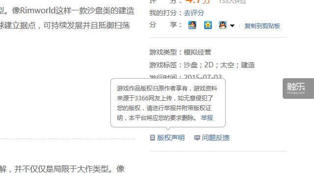 在3366上看《环世界》的版权声明,那上面写着:“游戏作品版权归原作者享有,游戏资料来源于3366网友上传,如无意侵犯了您的版权,请进行举报并附带版权证明,本平台将应您的要求删除”,后面捎带了“举报”两个字的超链接。