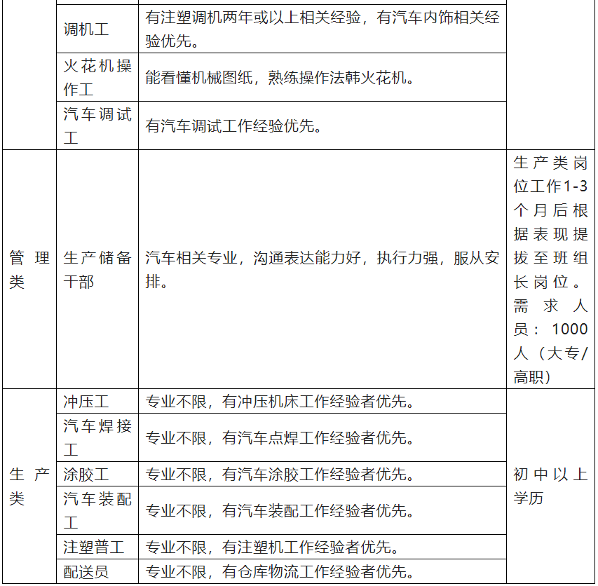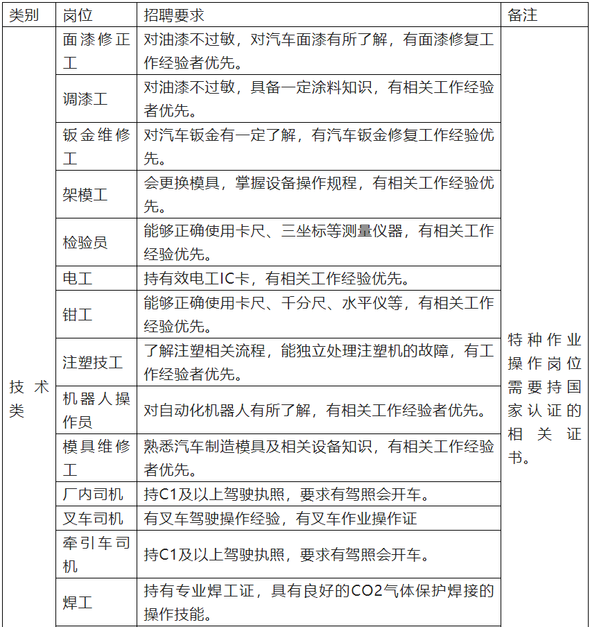 据悉,项目此次招聘涵盖技术类、管理类、生产类三大领域,涉及生产储备干部、调漆工、电工、钳工等20多类工种和岗位,年内总用工需求量超过1万人,项目总用工需求量超过2万人,近期先行招聘约1500人。本次招聘人员综合工资约为5500元至8000元,提供免费宿舍,入职当天即给正式员工缴纳社保五险(养老保险、工伤保险、医疗保险、失业保险、生育保险),具体招聘要求可查看济南起步区比亚迪项目招聘简章,或登录比亚迪相关网站查询: