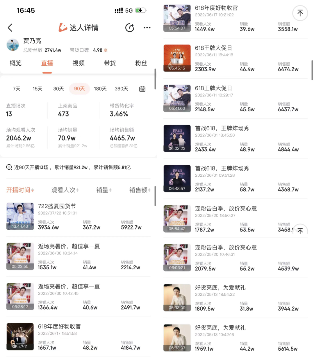 2020年,在试图通过直播曲线复出的李小璐,被迫离开直播间几个月后,贾乃亮倒是收获了第一场成绩拿的出手的直播——5小时的直播,吸引了5000万人次观看,带货金额达2.4亿。