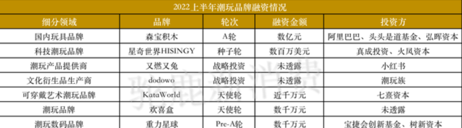 有意思的是,在泡泡玛特股价遭遇大跌和在新消费市场整体遇冷的大环境下,仍有大量资本流入潮玩市场赛道。根据驼鹿新消费不完全统计,2022年上半年国内有7个潮玩品牌获得融资,融资金额达到数亿元。
