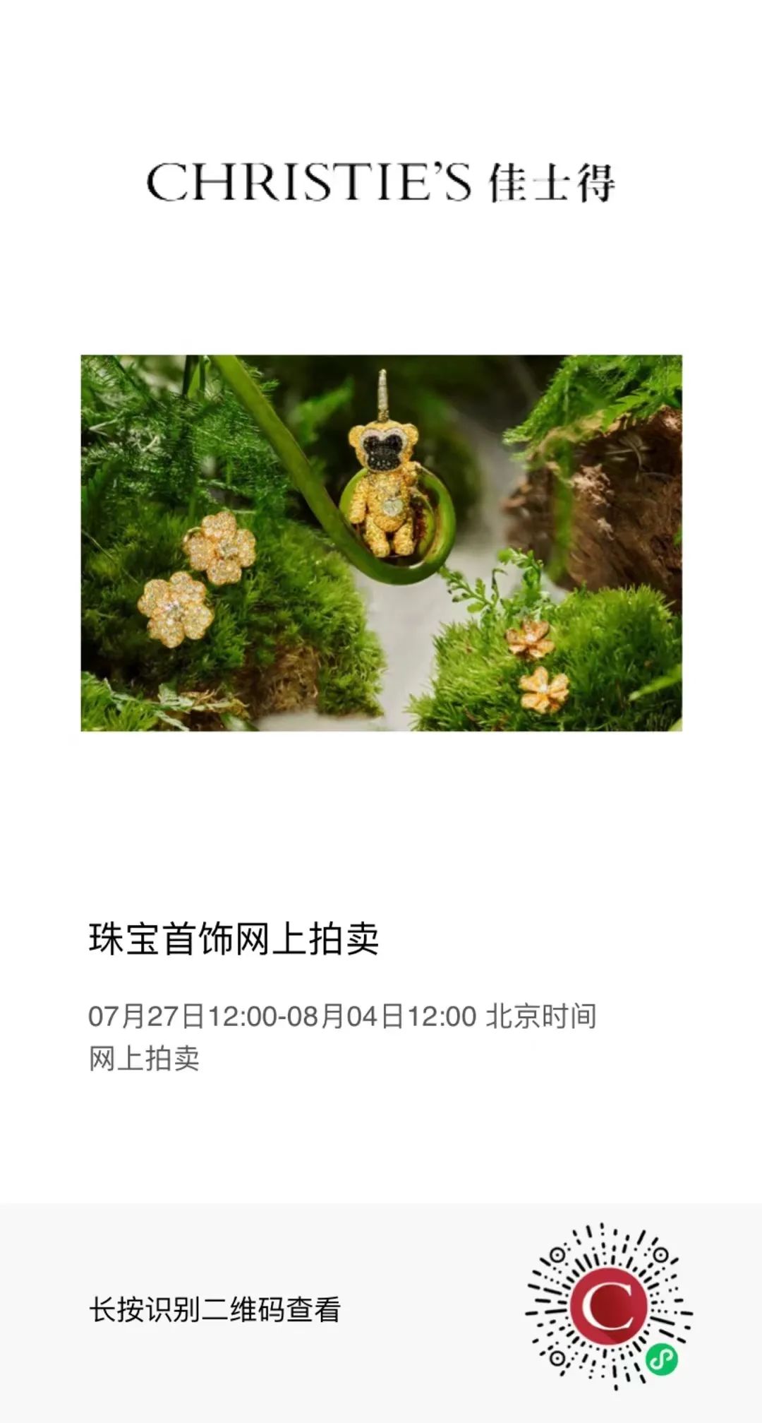 Qeelin 与海南改革发展研究基金会合作,将这款珠宝委托佳士得拍卖行,作为封面拍品(第57号拍品)在其网上珠宝专拍上进行为期一周(7月27日-8月4日)的慈善拍卖,所得款项将全数捐给海南省林业局,直接用以支持推进海南热带雨林和海南长臂猿的保护工作。