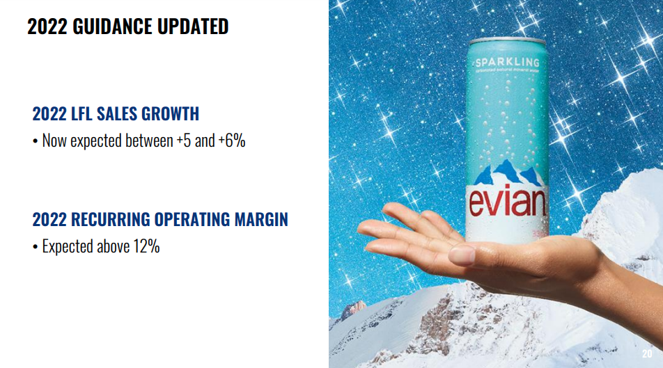 今天,达能还宣布更新2022年业绩预期,预计全年销售同比增长5%~6%,经常性经营利润率超过12%。