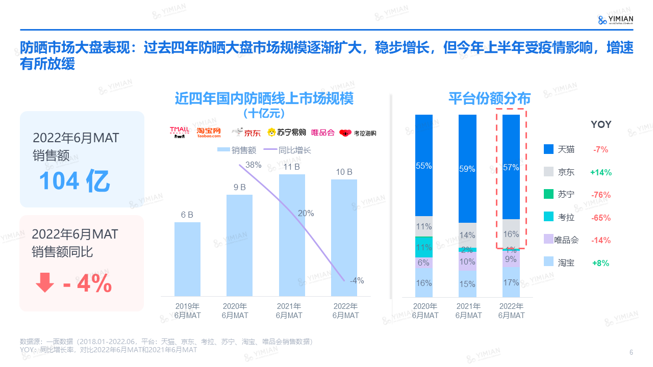 回到防晒市场的大盘,从2021年7月到2022年6月,防晒品类整体市场的规模是104亿,同比下降了4%。从渠道来看,天猫依然是最大的渠道,份额占比57%,但相较去年来说是有所下跌的。